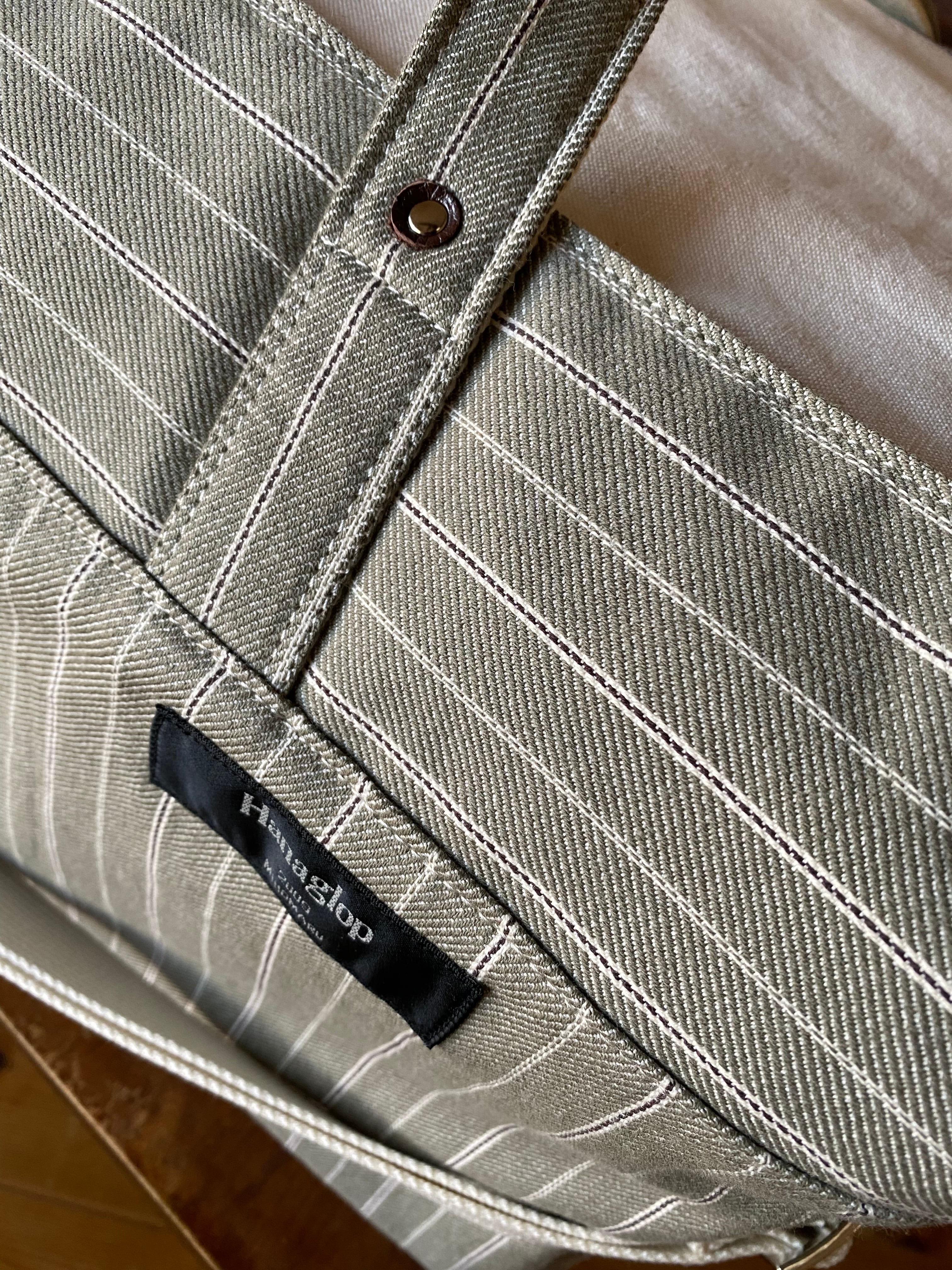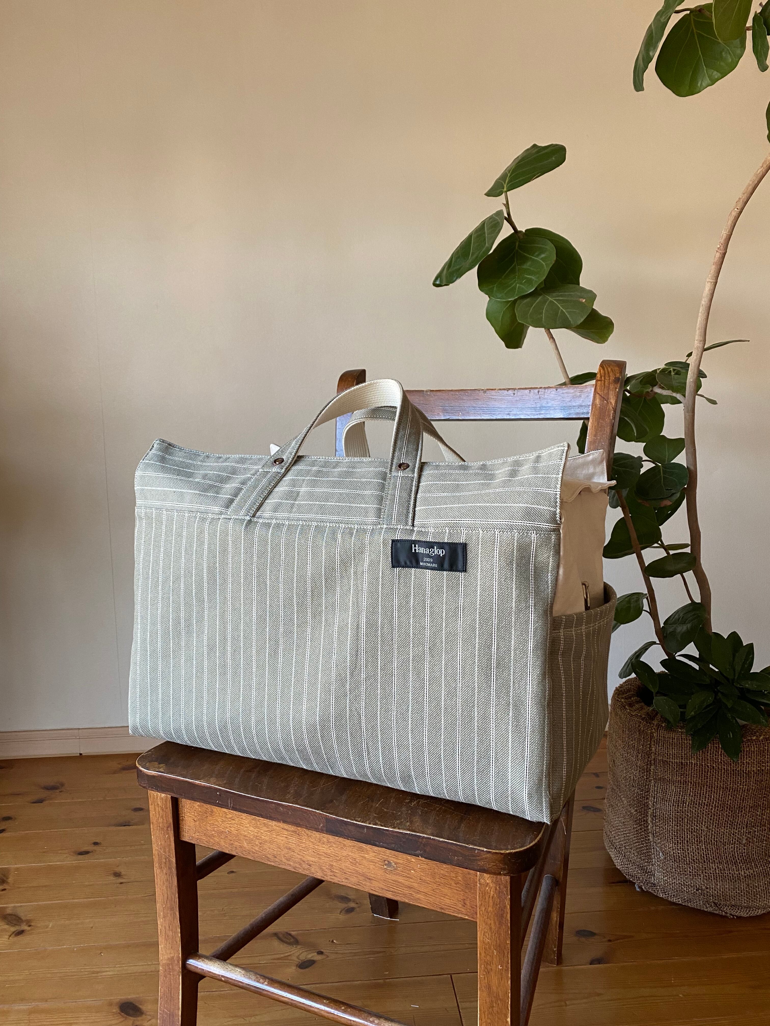 スモーキーグリーンの厚手コットン(少し起毛)と11号生成り帆布で作成しました。